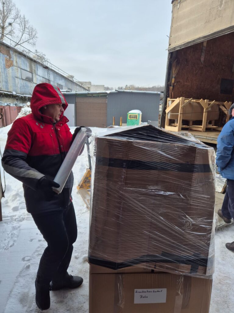 Zusätzlich konnten wir wertvolles Inventar aus dem mittlerweile geschlossenen Marktkrankenhaus aus Werneck übernehmen. Jede verbleibende Lücke wurde mit hunderten Paketen gefüllt, die von unseren ehrenamtlichen Helfern und Spendern vorbereitet wurden: