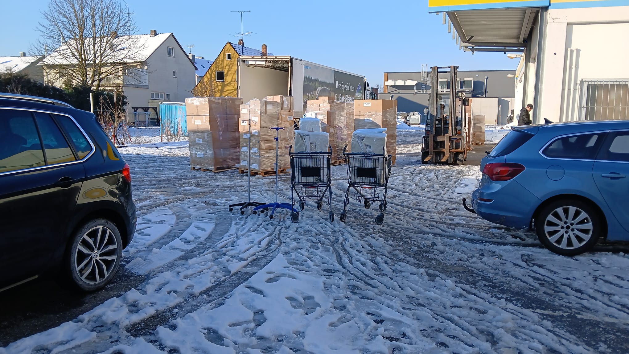 19. Februar: Start in Marktheidenfeld Der erste Teil der Ladung bestand aus ausgemusterten Krankenhausbetten des Kreiskrankenhauses Marktheidenfeld. Ein großes Dankeschön geht hierbei an den Bauhof Marktheidenfeld, der uns tatkräftig beim Verladen unterstützte.