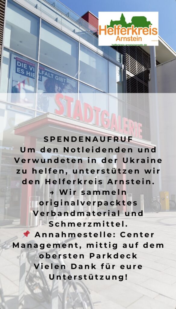 Der Helferkreis Arnstein freut sich über eine großartige und tatkräftige Unterstützung aus Schweinfurt! Das Centermanagement der Stadtgalerie Schweinfurt hat sich unserer laufenden Sammlung von dringend benötigtem Verbandsmaterial und Medikamenten für die Zivilbevölkerung in der Ukraine angeschlossen.